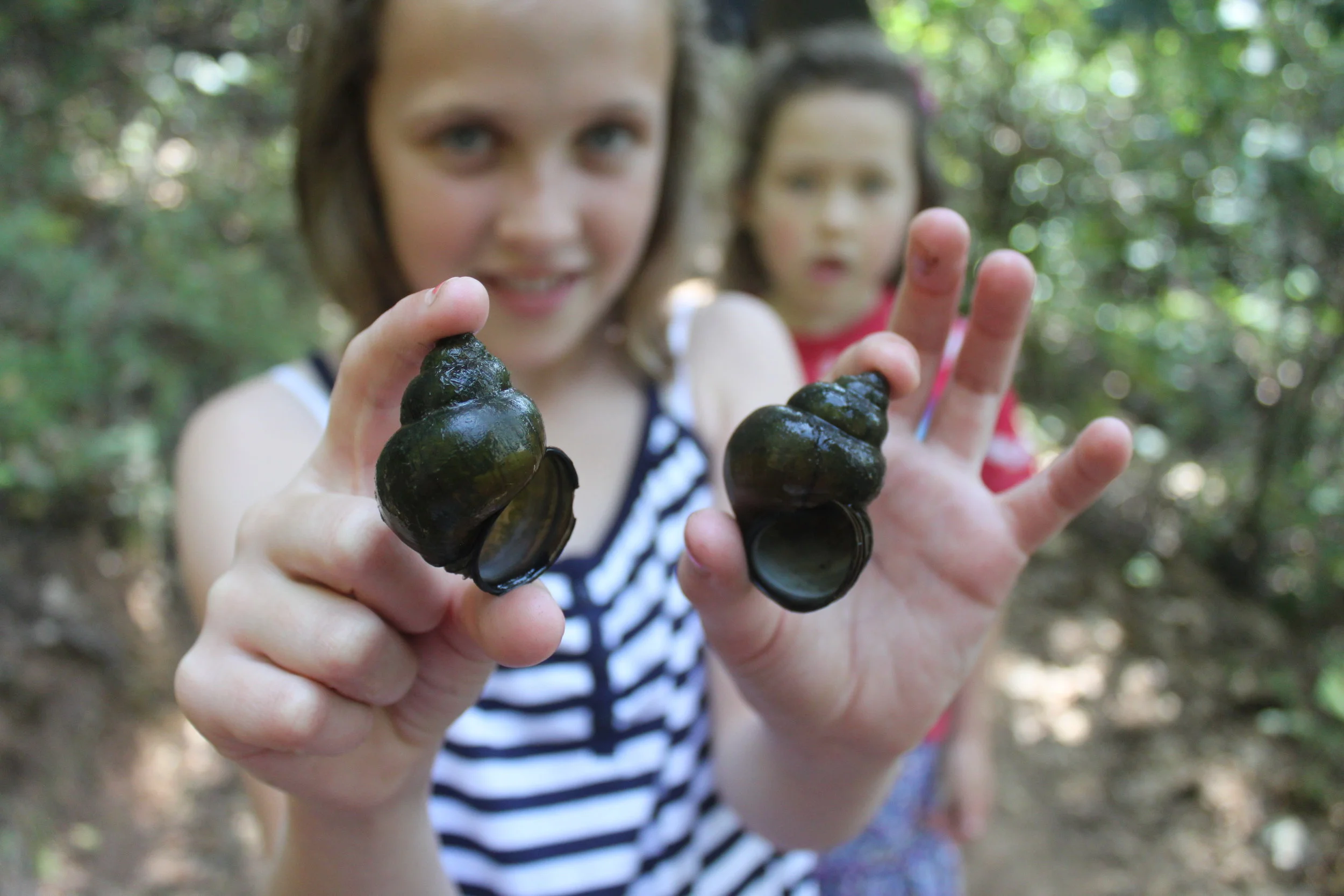 Two young girls with aquatic snails.